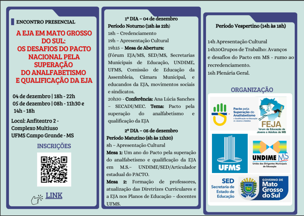 O EVENTO INTITULADO “A EJA EM MATO GROSSO DO SUL: OS DESAFIOS DO PACTO NACIONAL PELA SUPERAÇÃO DO ANALFABETISMO E QUALIFICAÇÃO DA EJA” FOI CONSTITUÍDO EM PARCERIA ENTRE AS INSTITUÇÕES: FÓRUM ESTADUAL DE EJA DE MATO GROSSO DO SUL; UNIVERSIDADE FEDERAL DE MATO GROSSO DO SUL; SECRETARIA DE ESTADO DE EDUCAÇÃO DE MATO GROSSO DO SUL; UNIÃO DOS DIRIGENTES MUNICIPAIS DE EDUCAÇÃO – UNDIME/MS.