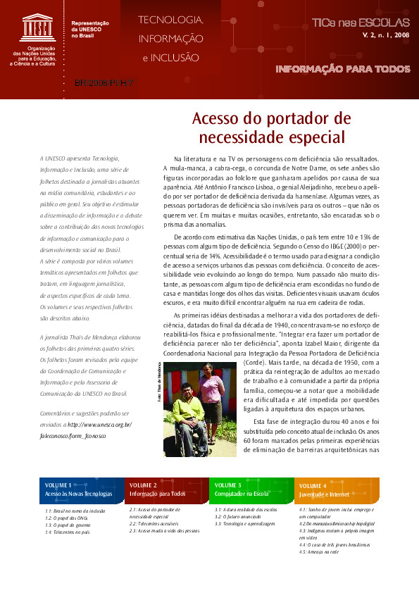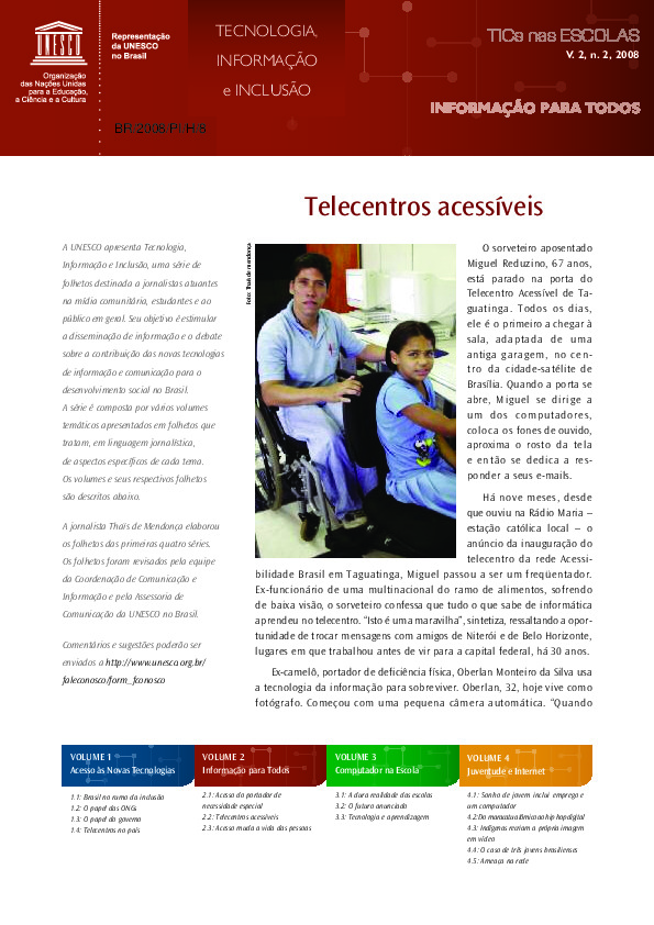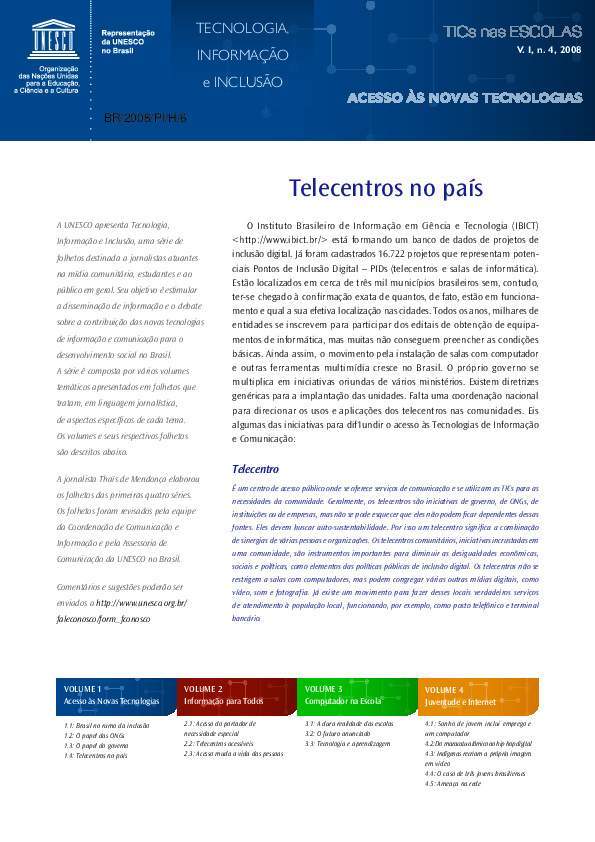 4 páginas. Ilustrado. Documento da série "Tecnologia, Informação e Inclusão". Foco em políticas públicas e programas federais. Inclui entrevistas com gestores (ex: Rogério Santanna, do Ministério do Planejamento) e descrições detalhadas de telecentros. Contém seção "Questões para discussão" e lista de sites governamentais. Código: BR/2008/PI/H/5.