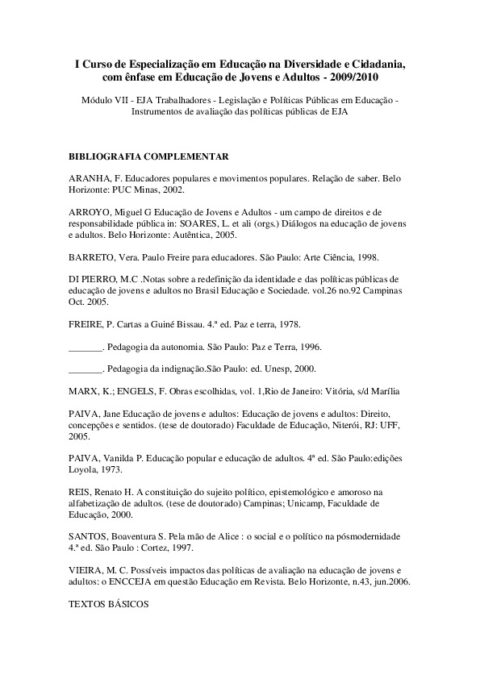 - Seminário Nacional de Educação de Jovens e Adultos: 1º Ano do Pacto pela Superação do Analfabetismo e Qualificação na Educação de Jovens e Adultos (Pacto EJA)