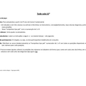Jogo vale 15 – instruções e catalogaçãoEquipe Portal24 de julho de 2025 Documentos Jogo vale 15 – instruções e catalogação Baixar CEF07-008.preview Baixar Jogo vale 15 – instruções e catalogação CEF07-008.preview MetadadosTítuloJogo vale 15 - instruções e catalogaçãoAutoriaAmérico Borges | GTPA/DF - Fórum EJA/DF | Randiê-zaire DinizAssuntoEducação | EJA - Educação de jovens e adultos | Áreas do conhecimento > MatemáticaOutros assuntosJogos EducacionaisLocal de publicaçãoBrasil > Centro-Oeste > Distrito Federal > BrasíliaObservação sobre o localAsa norteDescriçãoJogo vale 15 - instruções e catalogação. Área: Matemática para séries iniciais. Conteúdo: Adição com números naturais e raciocínio lógico Item anteriorFotos EJA CEF 07 Asa Norte (2008) Próximo itemPROEJA TransiArte na Educação de Jovens e Adultos e Educação Profissional