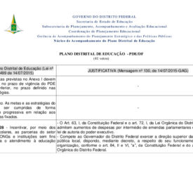 Lei nº 5.499, de 14 de julho de 2015 – Plano Distrital de Educação (PDE) – sancionado com vetosEquipe Portal24 de junho de 2025 Documentos dodf_135_pde_sancionado_com_vetos Baixar MetadadosTítuloLei nº 5.499, de 14 de julho de 2015 - Plano Distrital de Educação (PDE) - sancionado com vetosAutoriaFórum Distrital de Educação (FDE) | GTPA - DFAssuntoPolítica educacional | Política educacional > Políticas públicasOutros assuntosPlano Distrital de Educação - PDEAno de PublicaçãoDécada de 2010 > 2015Local de publicaçãoBrasil > Centro-Oeste > Distrito Federal > BrasíliaDescriçãoLei nº 5.499, de 14 de julho de 2015 - Plano Distrital de Educação (PDE) - sancionado com vetos, publicação do Diário Oficial do Distrito Federal.NotasDiário Oficial do Distrito Federal (DODF), Ano XLIV, Suplemento ao nº 135, Seção I Item anteriorPlano Distrital de Educação (PDE) – Quadro comparativo de vetos e justificativas Próximo itemProjeto de Lei nº 428, de 2015 – Redação Final – Aprova o Plano Distrital de Educação – PDE