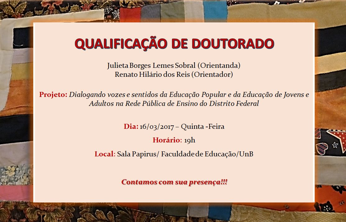 Qualificação de doutorado – convite – Julieta Borges Lemes SobralEquipe Portal25 de julho de 2025 Documentos qualificacao_tese_julieta-borges_2017 Baixar MetadadosTítuloQualificação de doutorado - convite - Julieta Borges Lemes SobralAutoriaJulieta Borges Lemes SobralAssuntoEducaçãoOutros assuntosAdministrativo > Carta/Convite | Tese de DoutoradoAno de PublicaçãoDécada de 2010 > 2017Data de publicação16 de abril de 2017Local de publicaçãoBrasil > Centro-Oeste > Distrito Federal > BrasíliaObservação sobre o localFE/UnB - Faculdade de Educação da Universidade de BrasíliaDescriçãoConvite para qualificação de doutorado da estudante Julieta Borges Lemes Sobral, sob o projeto "Dialogando vozes e sentidos da Educação Popular e da Educação de Jovens e Adultos na Rede Pública de Ensino do Distrito Federal"Horário do evento19h Item anteriorPROEJA TransiArte na Educação de Jovens e Adultos e Educação Profissional Próximo itemLançamento do GRALE III na América Latina e Caribe – 3º Relatório global sobre aprendizagem e educação de adultos