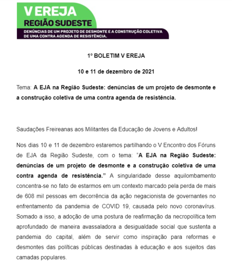 Relatório final EREJA SudesteFórum EJA ES18 de novembro de 2024 Documento EREJA.preview Baixar MetadadosTítuloRelatório final EREJA SudesteAutoriaFórum EJa ESAssuntoEvento | Evento > Eventos EducacionaisOutros assuntosRelatório final EREJAData de publicação10 de dezembroAno de PublicaçãoDécada de 2020 > 2021 | Década de 2020Coleção ou eventoEREJA > 6º EREJA SUDESTELocal de publicaçãoBrasil | Brasil > Sudeste > Espírito Santo | Brasil > SudesteObservação sobre o localRegião sudesteEditor(a) ou InstituiçãoUFES - Universidade Federal do Espírito SantoDescriçãoNos dias 10 e 11 de dezembro de 2021 tivemos o V EREJA (SUDESTE), a partir de levantamentos feitos nos encontros foi construído o relatório final, segue agora para conhecimento de todos.NotasO relatório está disponível no drive, segue o link: https://drive.google.com/file/d/1UFwQyoie4Xbv3Z_fAadoOPoEVAmr0ocp/view Item anteriorCurso de Extensão: O QUE HÁ DE NOVO NA EJA? Atualizações de um percurso recente em tempos de desmonte Próximo itemCampanha busto Paulo Freire