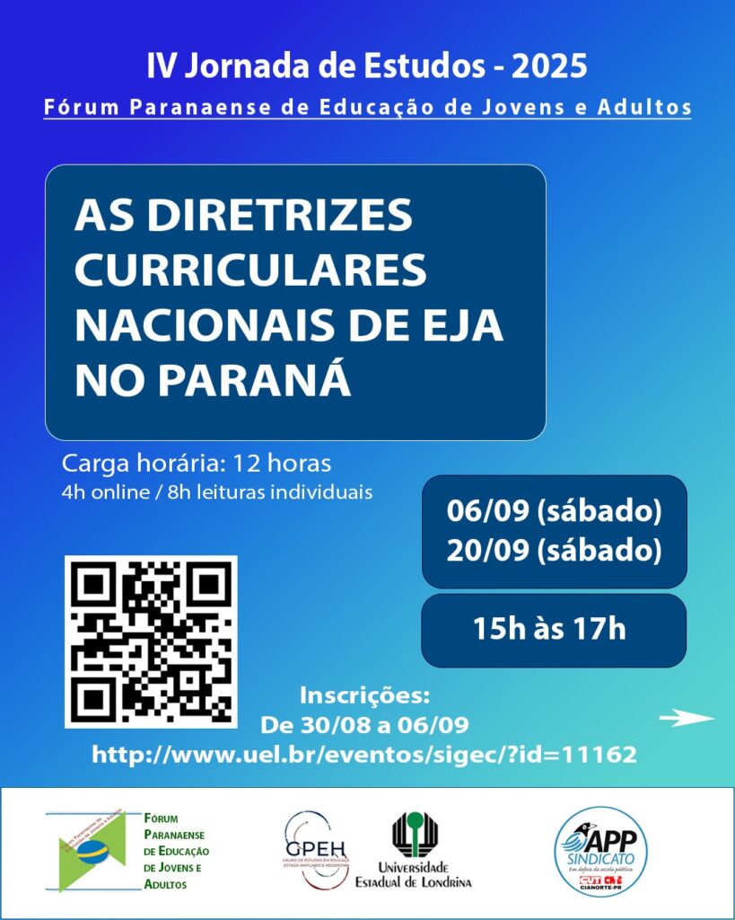 🚩O Fórum Paranaense de Educação de Jovens e Adultos é um coletivo que reúne estudantes, professoras e professores, funcionárias e funcionários, equipes pedagógicas e diretivas de escolas de EJA e todas as demais pessoas que queiram participar por entender a necessidade e importância dessa modalidade da educação básica. Saiba Mais