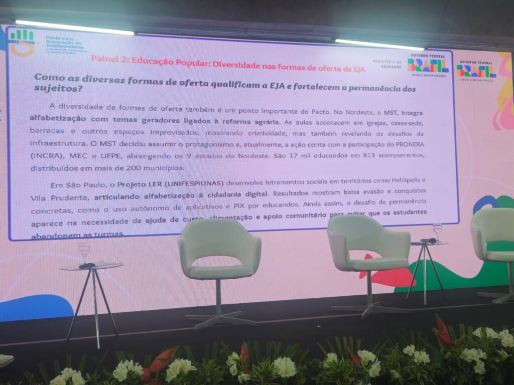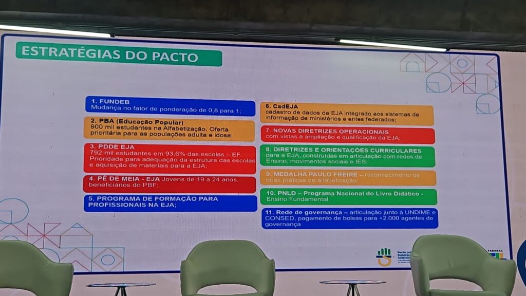 O Ministério da Educação (MEC) realizou, em 10 de setembro, em Brasília, o Seminário Nacional de Educação de Jovens e Adultos para marcar o 1º ano do Pacto pela Superação do Analfabetismo e Qualificação na EJA (Pacto EJA). O evento reuniu autoridades e representantes da sociedade civil para reafirmar o compromisso com a superação do analfabetismo e a valorização da EJA.