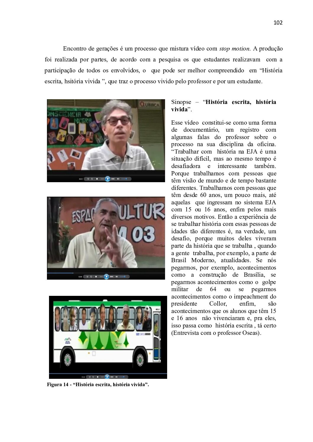 Produção estética 01 ano 2008 da oficina transiarte na disciplina de história VIDEO-Historia-escrita-historia-vivida-Proeja_360P Esse vídeo constitui-se como uma forma de documentário, um registro com algumas falas do professor sobre o processo na sua disciplina da oficina. “Trabalhar com história na EJA é uma situação difícil, mas ao mesmo tempo é desafiadora e interessante também. Porque trabalhamos com pessoas que têm visão de mundo e de tempo bastante diferentes. Trabalhamos com pessoas que têm desde 60 anos, um pouco mais, até aquelas que ingressam no sistema EJA com 15 ou 16 anos, enfim pelos mais diversos motivos. Então a experiência de se trabalhar história com essas pessoas de idades tão diferentes é, na verdade, um desafio, porque muitos deles viveram parte da história que se trabalha , quando a gente trabalha, por exemplo, a parte de Brasil Moderno, atualidades.Baixar
